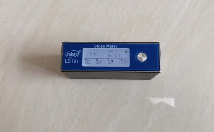 第三步:最后將幾個測試點的數(shù)值相加除以測量次數(shù),得出平均值,該值即時大理石整體光澤度的數(shù)值。如:(73.1+73.2+68+68.4+69.4)÷5=74.2所以這塊大理石的表面光澤度為74.2GU。