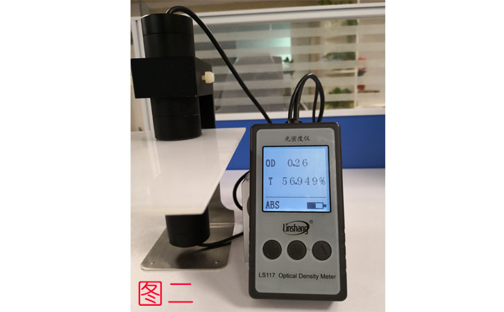 圖二是用乳白磨砂霧狀材料透光率儀LS117測(cè)試的同一片乳白材料的透光率,透光率值為56.949%。