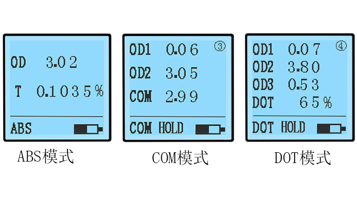 儀器具有3種測(cè)量模式,ABS絕對(duì)光密度測(cè)量模式,COM模式相對(duì)光密度測(cè)量模式,DOT模式網(wǎng)點(diǎn)面積率測(cè)量模式。