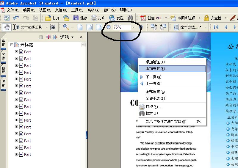 選擇好打開(kāi)時(shí)需要顯示的圖的大小,如75%,100%等。然后在也需要?jiǎng)?chuàng)建的書(shū)簽的頁(yè)面上,擊右鍵,選擇“添加書(shū)簽”。需要添加的頁(yè)面,就會(huì)在左側(cè)顯示,然后在左側(cè),修改需要顯示的書(shū)簽名字。